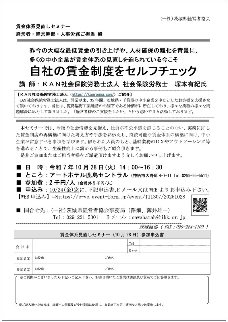 お申込みは下記PDFを印刷しご記入のうえ、FAX(0299-96-9418:(一社)茨城県経営者協会事務局)にて受け付けております。