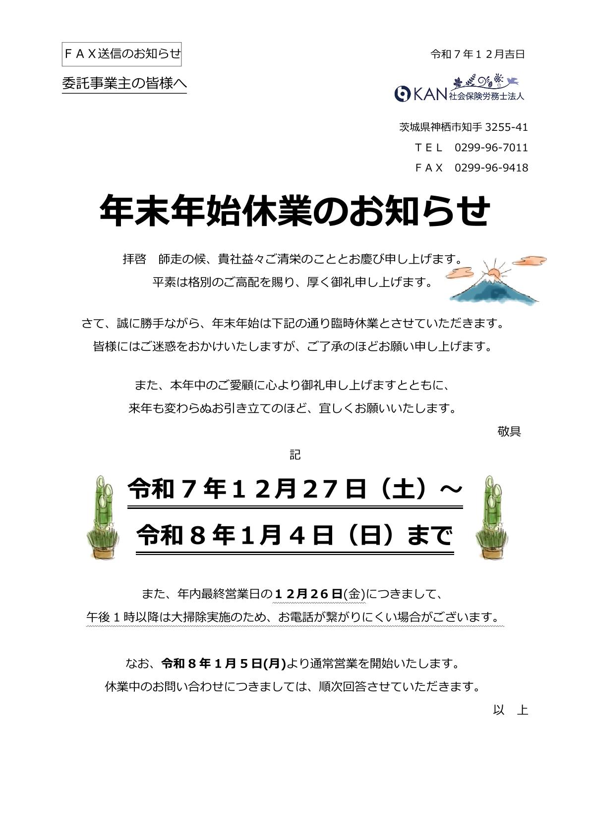 年末年始休業のお知らせ