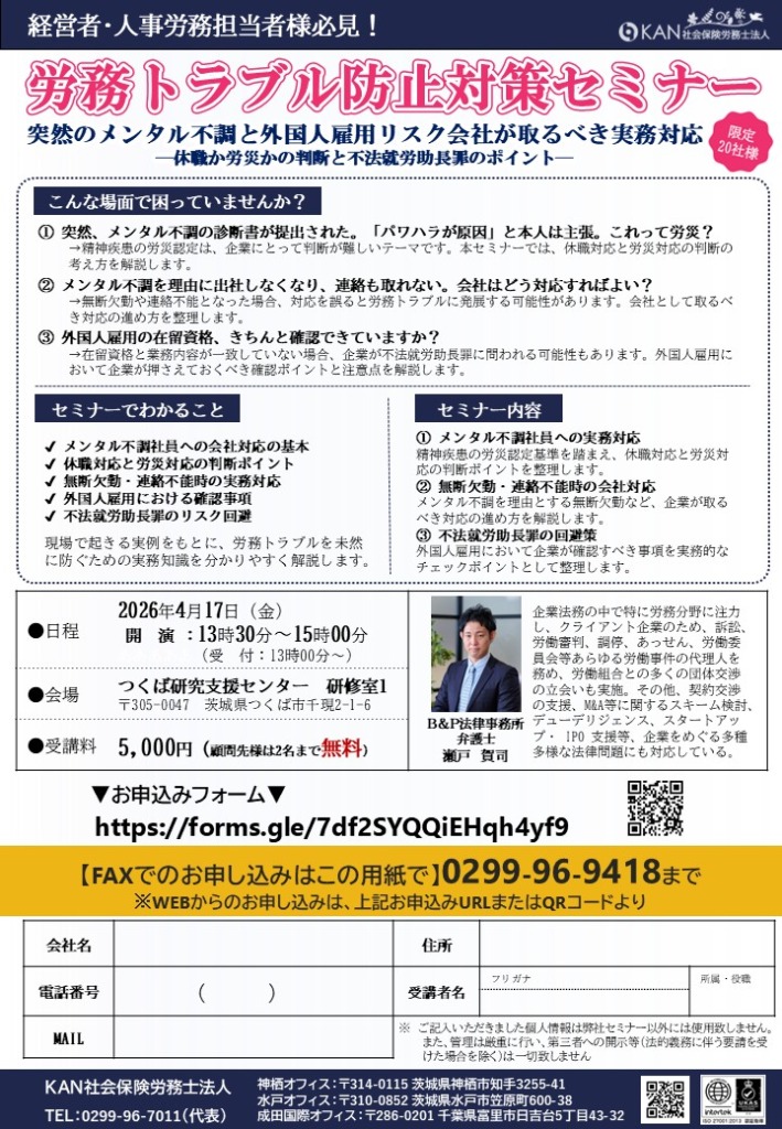 【4/17㈮開催】紛争解決専門弁護士による「労務トラブル防止対策セミナー」申込受付中!