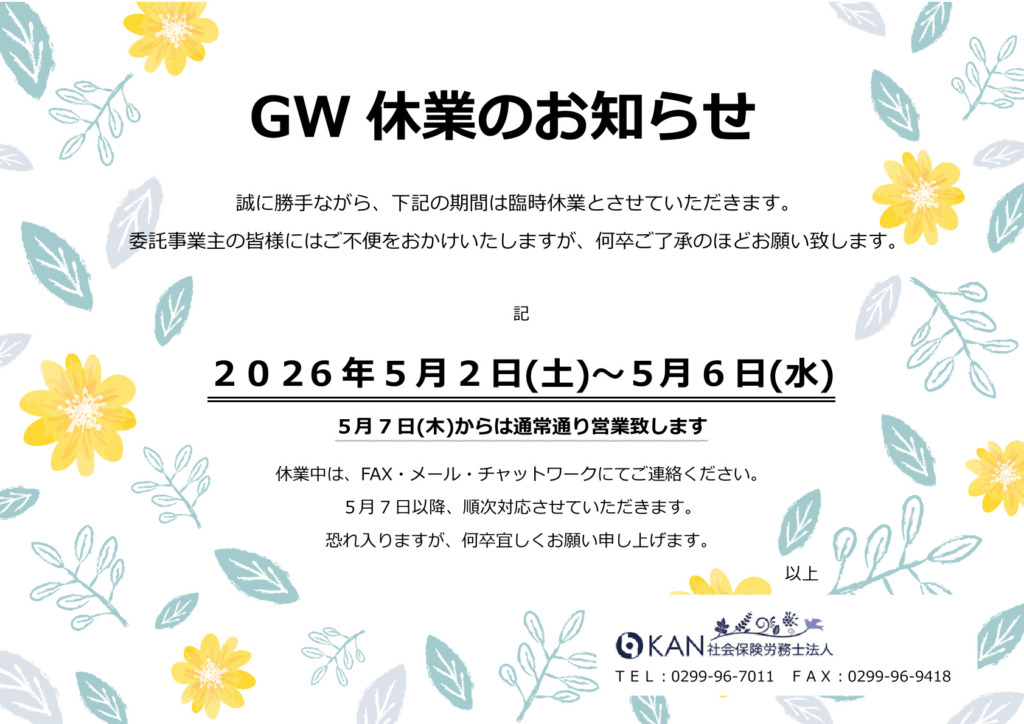 休業期間中はFAX・メール・チャットワークにてご連絡ください。